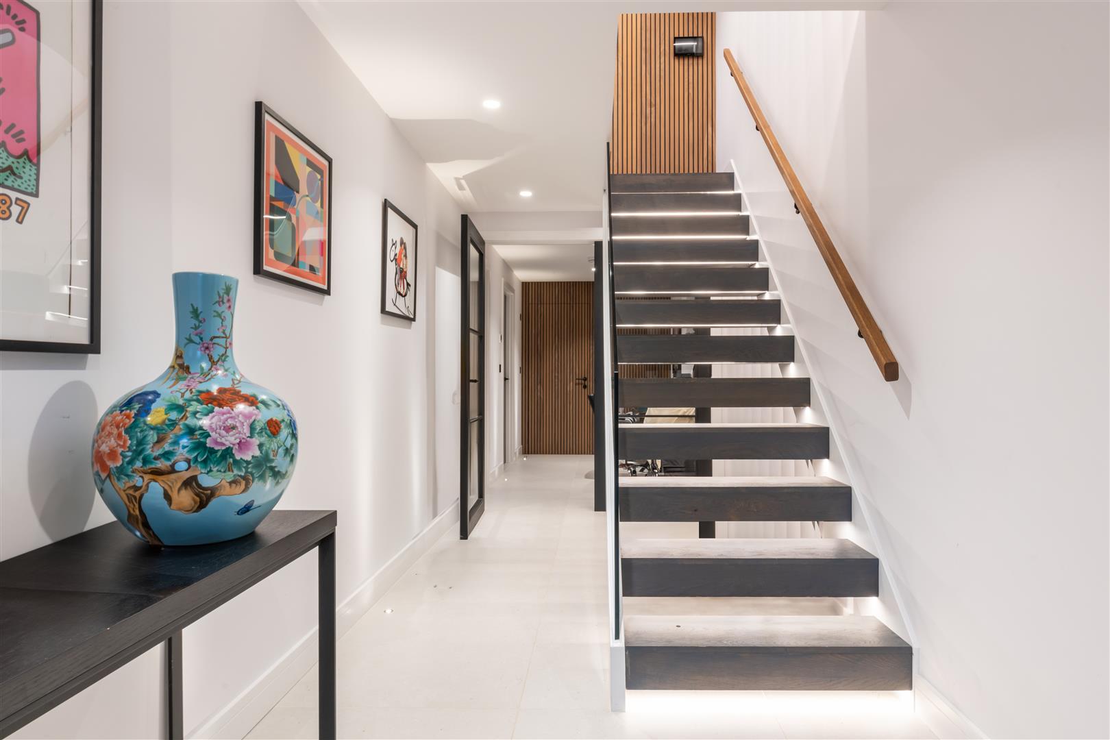 An exceptional example of contemporary design, this recently constructed residence has been built to a striking design by Dot Architecture. Extending to just over 2,050 square feet and arranged across three beautifully planned floors, the property offers thoughtfully curated living space with outstanding attention to detail throughout. The top floor provides three bedrooms and two luxurious bathrooms, creating a well-balanced and private family level. The middle floor is dedicated to an impressive 36 foot open plan living space ideal for entertaining and modern living with seamlessly combining kitchen, dining and reception areas beneath clean architectural lines. On the ground floor, a stunning bedroom suite offers versatility, perfectly suited for guests, multigenerational living, or a private workspace. The reception hall makes an immediate statement, featuring a bespoke staircase with illuminated treads and an inner lobby set behind double doors, offering excellent potential for a dedicated study area. Decorative finishes throughout are of an exceptional standard, enhanced by a beautifully designed programmable lighting system serving the principal rooms and exterior. The contemporary kitchen centres around a substantial island with breakfast bar and integrated wine fridge, complemented by a full suite of high-end appliances. A cleverly concealed utility and pantry space maintains the home’s sleek, uninterrupted aesthetic. The specification is equally impressive, including underfloor heating throughout, ten photovoltaic roof panels, and an air source heat pump — delivering both comfort and energy efficiency. To the rear, a compact yet highly functional garden features a private sun terrace and low-maintenance synthetic lawn, providing an ideal outdoor retreat. This is a home designed for those who value architectural integrity, intelligent planning, and refined contemporary living.