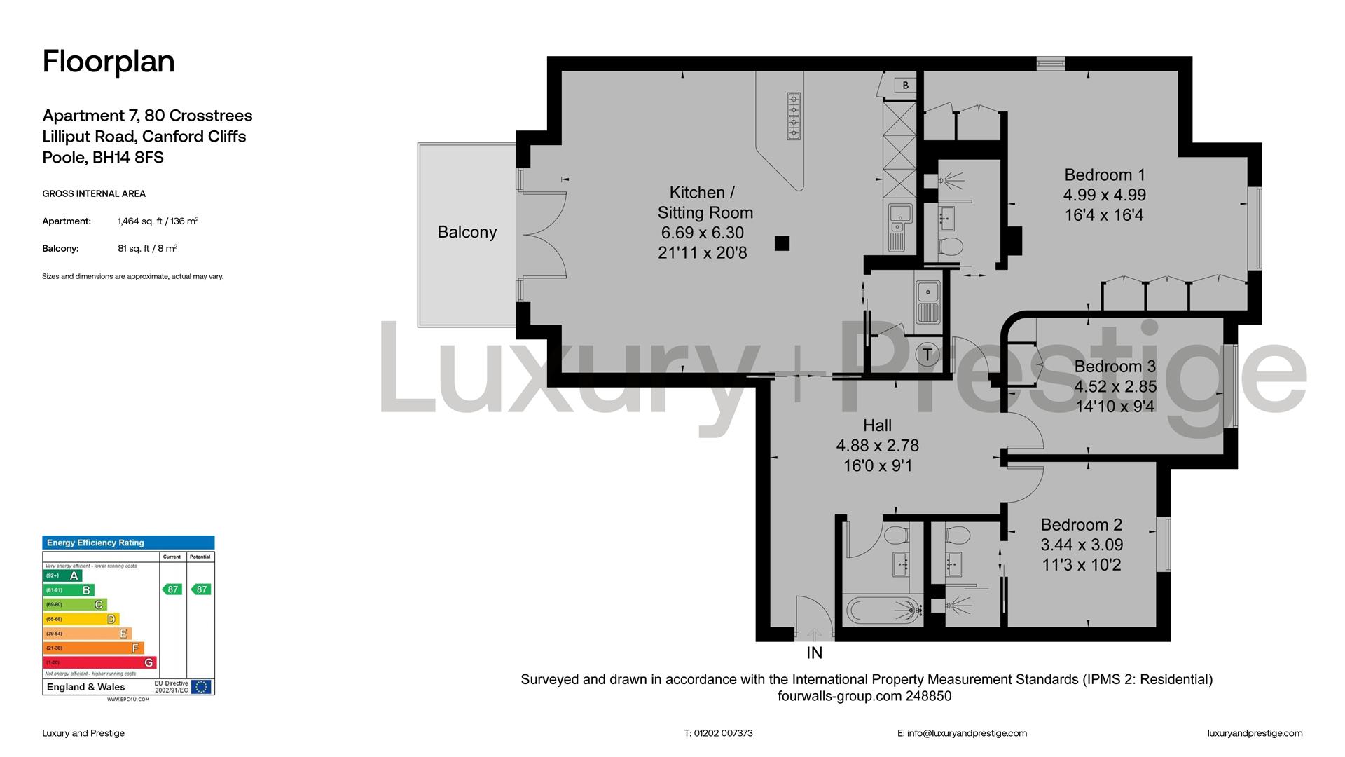 Crosstrees is a landmark development on the edges of the prestigious Parkstone Golf Course and close to the village of Canford Cliffs. Apartment 7 is located on the first floor and the accommodation extends to 1,464 square feet and the proportions of the rooms, together with the layout give it a real feeling of space. The large open plan living area includes a designer kitchen and ample space for dining and living, together with access to the balcony. There are three luxurious bedrooms including the master suite with an abundance of built-in wardrobes, a dressing room and en suite bathroom. Bedroom two also boasts its own en suite bathroom whilst bedroom three has use of the family bathroom - all of the bedrooms have plantation style shutters. There are two secure underground parking spaces and a lockable store room at basement level making it practical as well as stylish.