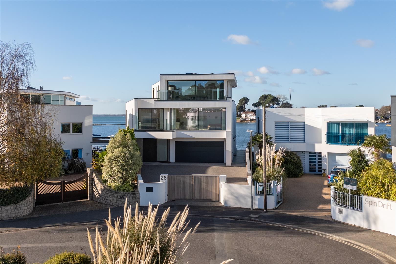 This is a wonderful example of contemporary architecture but to a design which truly showcases its waterfront location and its connection to the Blue Lagoon. The built form extends to over 6,100 square feet and it includes four stunning bedrooms, each with en suite facilities, a home office, a hugely impressive kitchen lifestyle room complete with spiral wine cellar and a top floor suite of entertaining rooms including a luxurious bar and a separate sitting with dedicated terraces. Outside space features prominently with a magnificent decked terrace connecting to the main open plan living space via motorised large format patio doors. The principal terrace extends to a lower level where there is a barbecue area as well as a hot tub / combined swim spa in close proximity to the waterfront where there are steps to a small wooden jetty. Other stand out features include the magnificent principal bedroom suite with its dedicated sun balcony, exquisite en suite bathroom, steam room and walk in dressing room. In addition there is a magnificent radius staircase, home automation, integrated audio and finger printed security on the front door.